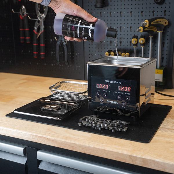 Ultraschallreinigung ist die effizienteste und wirkungsvollste Methode, um deine Kette bis tief ins Innere zu reinigen. Stabile und präzise Ultraschallwellen bei 40 kHz erzeugen Millionen mikroskopisch kleiner Blasen, die an den Kettengliedern implodieren und Schmutz, Wachs und Öl aus jeder Ritze entfernen. Das integrierte Heizelement erwärmt die Flüssigkeit auf bis zu 80 °C, wodurch der Reinigungsprozess noch effektiver wird und selbst hartnäckige Rückstände keine Chance haben. Mit den digitalen Bedienelementen kannst du Temperatur und Reinigungszeit präzise einstellen.