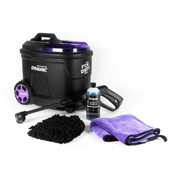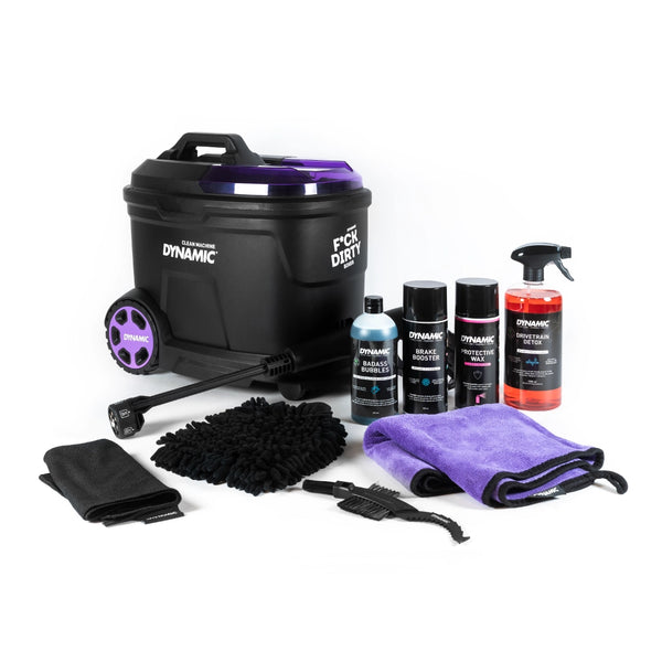 El Clean Machine Set incluye el Clean Machine, 1x Badass Bubbles, 1x Microfibre Bike Cleaning Glove, 1x Turbo Towel.