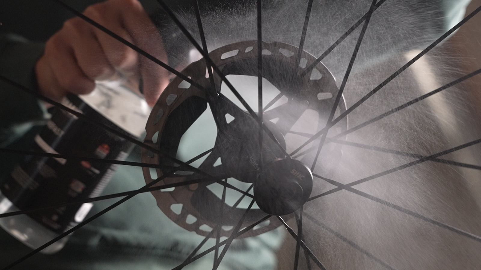 Il est préférable de retirer d'abord la roue du vélo pour avoir un meilleur accès à toutes les parties. Vaporisez le nettoyant pour freins directement sur les composants à nettoyer, comme les disques de frein, les bords de jante et les plaquettes de frein. Laissez agir quelques instants et utilisez un chiffon doux pour enlever la saleté. Vous pouvez aussi vaporiser d'abord le nettoyant sur un chiffon propre. Cela vous permet de mieux contrôler l'application et d'éviter d'utiliser trop de liquide ou qu'il pénètre dans des pièces comme les roulements.