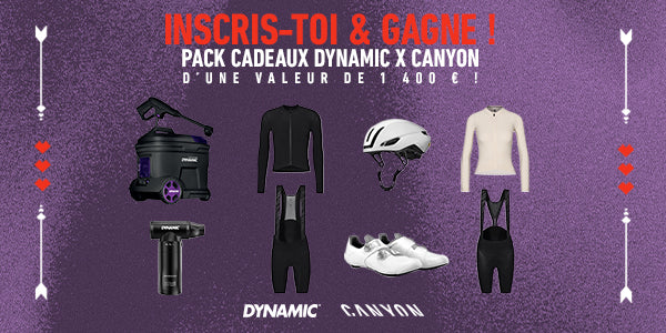 Inscris-toi pour avoir une chance de gagner 1 400 € de produits Dynamic et Canyon ! Ce pack comprend notamment une tenue complète, un casque, des chaussures, un nettoyeur haute pression et bien plus encore. Inscris-toi dès maintenant, ne passe pas à côté !